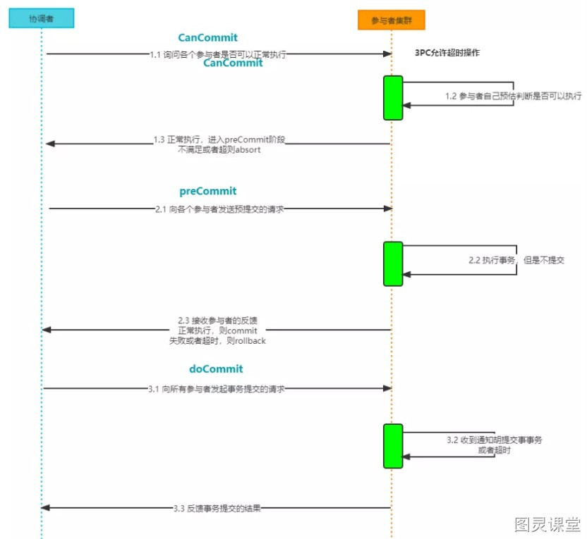 进入 doCommit 阶段后,无论协调者出现问题,或者协调者与参与者之间的网络出现问题,都会导致参与者无法接收到协调者发出的 doCommit 请求或 abort 请求。此时,参与者会在等待超时之后,继续执行事务提交。这其实基于概率来决定的,当进入第三阶段时,说明第一阶段收到所有参与者的 CanCommit 响应都是 Yes,意味着大家都同意修改了,并且第二阶段所有的参与者对协调者的 PreCommit 请求也都是同意的。所以,一句话概括就是,当进入第三阶段时,由于网络超时等原因,虽然参与者没有收到 commit 或者 abort 响应,但是他有理由相信:成功提交的几率很大。