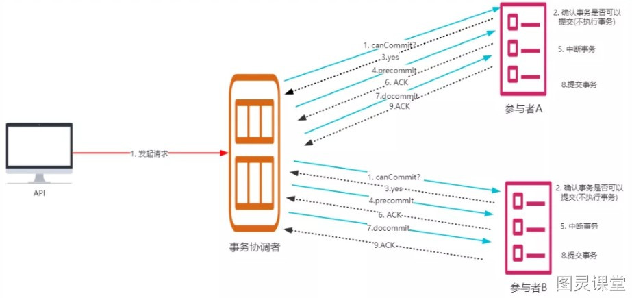 由事务协调者询问通知各个事务参与者,是否准备好了执行事务,具体流程如下: