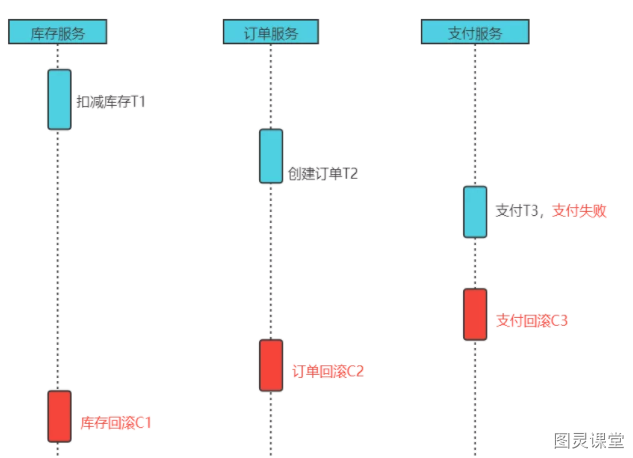 - (1)每个 Saga 事务由一系列幂等的有序子事务(sub-transaction) Ti 组成。
