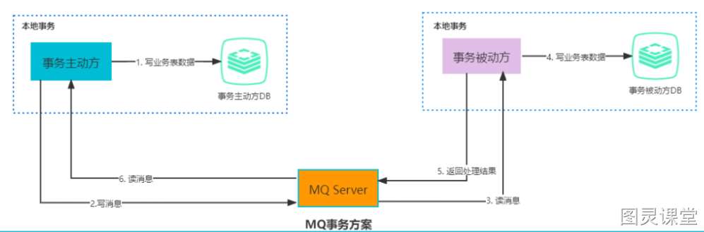基于 MQ 的分布式事务方案本质上是对本地消息表的封装,整体流程与本地消息表一致,唯一不同的就是将本地消息表存在了 MQ 内部,而不是业务数据库中,如下图: