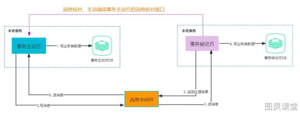 - 当②、③处理出错,由于事务主动方本地保存了消息,只需要轮询消息重新通过消息中间件发送,通知事务被动方重新读取消息处理业务即可。